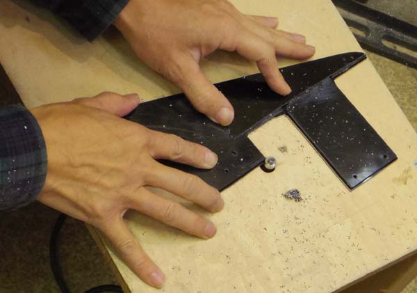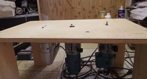 | これはその作業をするための台です 左からジグソー、面取り用トリマー、外周用トリマーと工具を逆さまに取り付けています これを使って↓の様に作業する訳です |