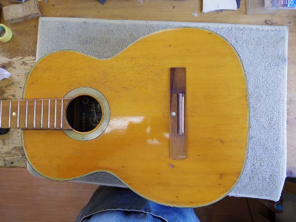 | これ見て分かります?? パッと見てすぐ分かった方は凄いと思います (と言うか私がボ〜っとしてるのか?) 何と!サドルがボディエンド側にあるんです!! 多分以前にブリッジ接着不良でブリッジが剥がれててしまったんでしょう それを元のオーナーが自分で貼り直したんでしょうがブリッジを貼り直す時に上下を間違えて貼り付けてしまったらしいんです 気が付いた瞬間「あ〜っ!!!!」って言って大笑いしたのですが クラシックタイプのブリッジは完全な長方形で逆さに貼っても元の位置に収まってしまいますからねぇ〜 弦を張る段階になって貼り間違えたのに気が付いて投げ出してしまったんでしょう と、云う様なトンデモな物が時々あるのですが今回ご依頼頂いたのはピックガードの製作 で、何故ピックガードを作り直す必要があったかというと… |