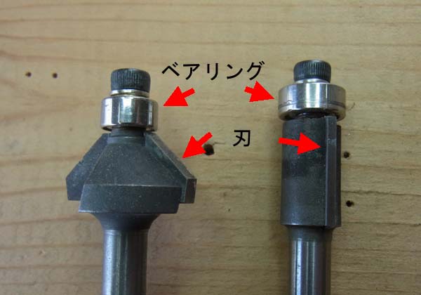 | コロ付きビットと言われる刃物です これをトリマーと言う機械に取り付けて高速回転させて使用するのですが 上についているベアリングが「型」にした元のピックガードをなぞり下の刃がベアリングと同じ直径で板材を削っていく仕組みになっていてこれによって全く同じ形をコピーする事が出来るんです 左側の傘状のコロ付きビットは3ピースのピックガード材などで外周の面を取る時に使用します |