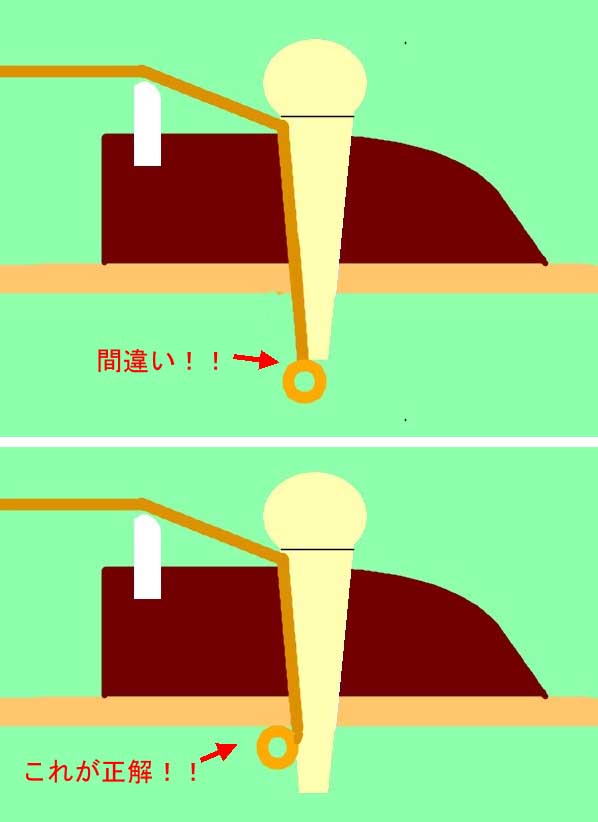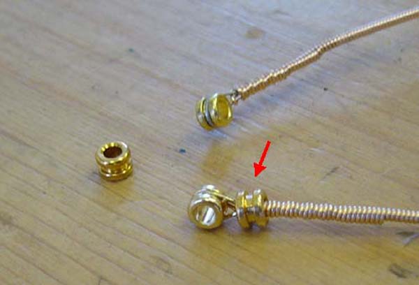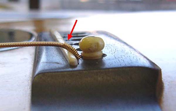 | 弦のボールエンドから2センチくらいの範囲は芯線が折り返されてその上に巻き弦が巻かれていますので太くなっています(赤矢印の部分) この太い部分が画像の様にサドルの上に乗っかると弦振動が阻害され鳴りが悪くなります また硬くなった所は振動したがりませんのでサドル上から振動せず、この部分から少しネック寄りから振動するようになりますのでサドル位置がネック寄りにズレたのと同じようになりピッチが悪くなります こう云った時はこの様にして弦を張ると問題が解消できます↓ |