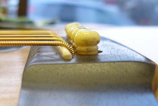 | 前回ペグの方の弦の張り方をご紹介しましたが、ブリッジの方の説明を忘れておりましたので弦張りの順番が逆になってしまいましたが今回は補足としてご紹介させて頂きます と言ってもエレキギターの場合はブリッジなりテールピースなりの弦穴を通すだけですのでわざわざ説明するような物ではありません 今回ご説明するのはアコースティックギターのブリッジ側の弦の張り方です まずフォークギターのブリッジピンの下はどうなっているかご存知ですか? |