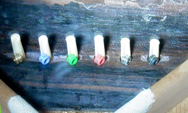 | 古い弦からボールエンドを外し、新しい弦に通してから(赤矢印)弦を張るだけです 弦に通したボールエンドがトップ板裏に当たって止まりますので、その分弦が奥に固定されるのです |