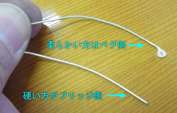 | まずナイロン弦の巻き弦は片方が柔らかく、もう一方が硬くなっています 硬い方をブリッジ側にします |