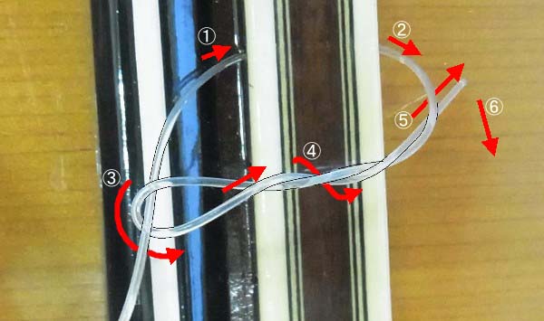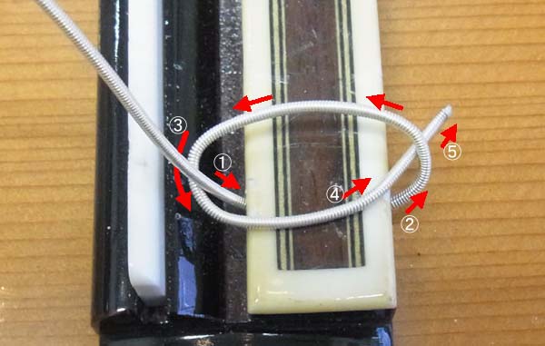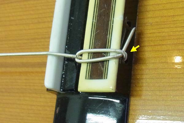| と、この様に結ばれます チューニングすると弦が引っ張られ、矢印の部分で自分の張力で弦先が挟み込まれて固定されます 次にプレーン弦側です こちらはちょっとややこしいですが |