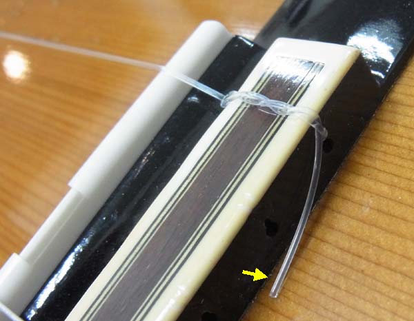 | と、この様に結ばれます プレーン弦は滑りやすいので弦先の余分な部分(黄色矢印)はこれくらい長めにしておいたほうが良いでしょう 結び目が固くなるまで弦は滑ってズレて行きますので、この部分を短くしていると固く結ばれる前に解けて外れてしまう事があります 単に外れるだけでしたら結び直せばよい事なのですが、結びが解ける時に弦先がトップ板に激しく叩き付けられトップ板に傷をつけてしまいます ナイロン弦なんで大したダメージは無いように思われるかも知れませんが、これが結構な深い傷を負わせてしまうので私は用心してこれくらい弦先を長めにして張ります |