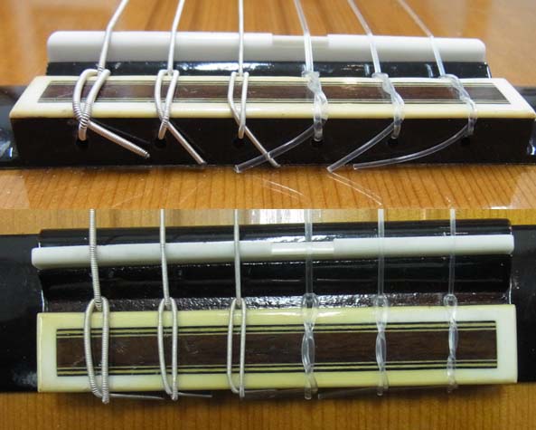 | この様に。 理想を言えば6弦はこの様にグキッっと曲がって欲しくないのですが、このギターの場合は構造上しようがありませんし太いところがサドルに乗るよりはずっとマシです なぜ6弦のような太い弦を強く曲げたく無いかはまたいずれ記事にさせて頂きます 次にクラシックギタータイプのナイロン弦のブリッジでの留め方です |