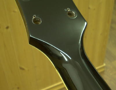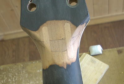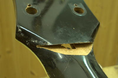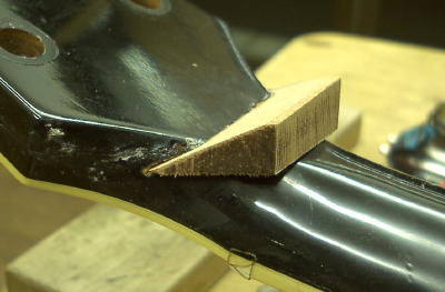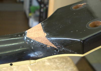 ちょっとしたアクシデントで最愛の愛器のネックが折れちゃったらアナタどうします? お金は無いし自分で直しちゃいますか? 瞬間接着剤を流し込んで手で押さえて「フーフー」 どうやらくっついたみたい!よ〜っしゃチューニングしてぇ〜♪ と弦を張ったら「バンッ!」 接着面から見事に外れちゃったぁ〜(T_T) と、これ良くあるパターンなのですが 素人の方はこうして直らなかったとき、大抵の人は 「やっぱ瞬間接着剤じゃダメだなぁ〜」と思うようですが ダメなのは接着剤ではありません!あなたのやり方が大間違いです! このコラムを見ていただいてる方は気づいておられるでしょうが 我々プロは接着の際は必ずクランプを使って圧着し、 瞬間接着剤を使っても丸一日は固定して置いています こうするかしないかで成功率はグン!と変わります ま、とは言っても素人さんはネック折れなんぞ自分で直そうなんて 考えない方が良いですよ! これからご紹介するレスポールは まさにその例のネック折れで やっかいな事に開いた口に接着剤がダマのようになってこびりついており そのまま仮クランプしても接着剤のダマが邪魔して 割れ目がピッタリと噛み合わず、このままでは接着できないので 接着剤がこびりついた部分を木部ごと切除して埋め直す と云う大工事になりました (すみません、修理前の状態の写真を撮り忘れてしまいました(^_^;)) |