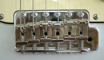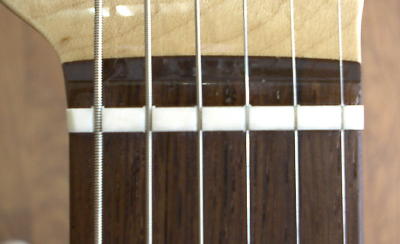 | イント・ナットを取り付けることでサドルの位置も変わってきます ノーマルナットの場合0フレットと1フレット(開放弦音と押弦音)のピッチ差までサドルで調整しているために 弦長は計算上のスケール(12フレットから324o)よりも長くなり (このギターの場合1弦で約+1o、6弦で約+5o) また、サドルの並びは通常は左画像のようにN字型になりますが イント・ナットで0フレットと1フレットのピッチ差を無くすことによって 右画像のようにサドルが全体に前進し計算上のスケールにより近づき(1弦で約0o、6弦で約+3o) サドルの並び自体もほぼ一直線になります。この辺りが目で見える効果と言えます 実際にどの程度ピッチに表れるかデータを取ってみました ◎データ取り状況 ◇ギター:O2 Factoryストラトキャスター 弦:アーニーボール・ハイブリッドスリンキー、009/011/016/026/036/046 弦高:1弦1,3o〜6弦1,6o(12フレット頂点から弦底点間) オクターブピッチ調整:12フレットでジャストピッチに調整 ◇チューナー:SEIKO・ST777 チューナー精度:±1セント ◇データ取り方法 開放弦音と各音を交互にチューナーに入力し相互のピッチ差を出し この作業をポジションごとに5回行いその平均値を表に書き入れる (例:5弦8フレットのピッチを調べた場合 まず5弦開放弦音(A)を弾きチューナーに入力→A±0セント 次に5弦8フレットを押さえて弾きチューナーに入力→F−1セント ピッチ差は−1セント この作業を5回繰り返し平均値を表に書き入れる) ※ピッチ差はチューナーのデジタル・セント表示でチェック 数値は一定しないがもっとも長く表示された数値をデータとする ※表内の数値単位はセントです ※チューナー自体に±1セントの誤差があります |