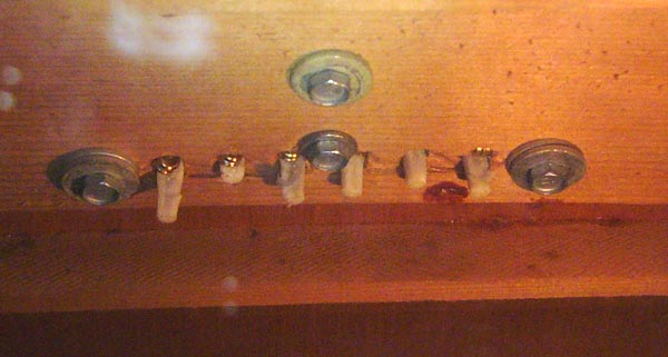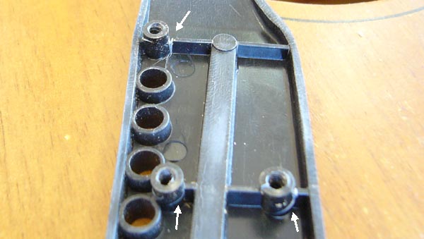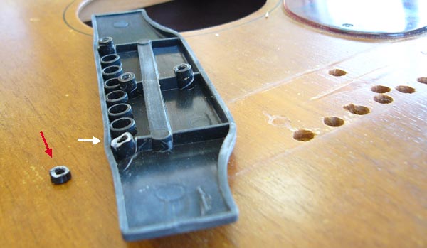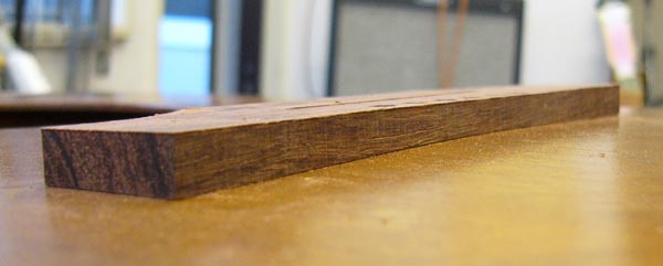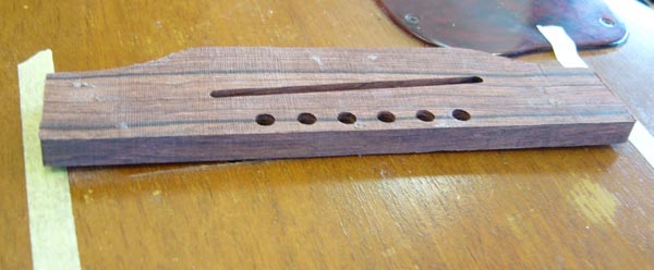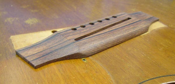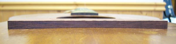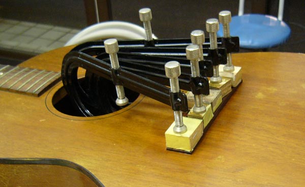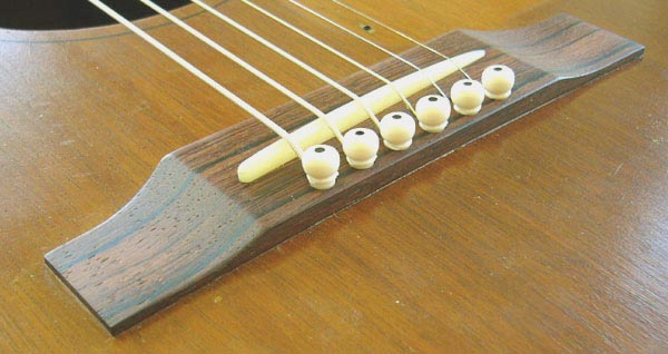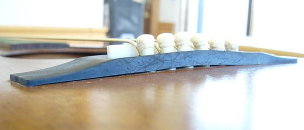| で、この様に仕上がります 最後にオイルフィニッシュで風合いを付けています 写真を撮り忘れましたがボールエンドが食い込んでいたトップ板内側には薄いメイプル材で裏打ちしてありますのでこれでちゃんとチューニングが出来るようになりました さて、ここで何度も出ている「ドーミング」ですが、ドーミングとはトップが盛り上がる事な訳ですからブリッジが始めの位置より高い位置に持ち上がり弦高が高くなると云う事になります。ですので今回のギターのようにプラスチック製のブリッジの場合にのみ問題が出る物ではなく普通の木製ブリッジのギターにも影響のあるものです。場合によってはサドルを削り切ってもまだ弦高が下がりきらない状態になり演奏性に影響が出ます では何故ドーミングが起きるのかと言えばこれは弦を張りっぱなし(チューニングしたまま)で放置した結果起きるのです ギターを弾き終えた後にそのまま保管するのか?、弦を緩めてから保管するのか?といった議論がありますがこれには諸々説があり、絶対これが正しい!と言ったような説は見つかっていないと思います で、これはあくまでもO2Factory説として説明させて頂きますが ギターやベースは弾いている時間より弾いていない時間の方が長いのが普通です(1日12時間以上弾いている人は例外です(^_^))であれば弾いていない時に弦が緩んでいるとネックがその状態に慣れてしまい、チューニングされた途端不安定な状態になると云う事になります チューニングしっぱなしで放置すると初期ではネックに反りが発生するでしょう。しかし、限りなく反ると言うことは無くどこかの点で止まるはずです。この止まった所でトラスロッドを調整し適正な反りに修正すれば後は極端に動く事は無いでしょうし、テンションに対してバランスの取れたネックに成長すると思います このようにネックだけの要素で考えると弾き終わった後に弦を緩める必要は無く、むしろネックに一定のテンションをかけておくことが必要と私は考えますが、アコースティックやフルアコギターの場合はテンションをかけ続けることでボディトップのドーミングやトップ落ちが起きる可能性があり重大な弊害となる場合があります。ここで「ネックの為に」と「ボディの為に」を天秤にかけると、トラスロッドや指板修正などで矯正する事が出来るネックよりも、そう簡単には矯正出来ないボディの方が重くなると私は思いますのでアコースティックやフルアコギターは完全に弦を緩めて保管する事をお勧めしています ではどの程度緩めるのかと言えば、トップの変形を考えるとほとんどテンションが掛からなくなるくらい緩めるのが良いのではないか。と私は思います ただし、3弦が巻き弦の場合、何回も緩めたり張ったりを繰り返すとすぐにペグポストのところで弦が切れてしまい3弦のストックを沢山持っておかなければならなくなりますので、妥協策と云う事で3弦のみチューニングを残しそれ以外を全部ベロンベロンに緩めておく事を私はお勧めしています 一方ソリッドボディやセミアコなど弦のテンションによりボディに変形が起き難い構造のギターやベースは基本的に張りっぱなしで保管する事を私はお勧めいたします ただし、60年代後期から70年代のフェンダーなどはネック材がメチャメチャに柔らかい場合がありトラスロッドを締め込むとトラスロッド自体がどんどんネックに食い込み、指板に割れが生じる物もあります、この様な場合はチューニングしっぱなしにしていては問題が出るかもしれません とは言えこの様な楽器はどの様に保管するか以前の問題であり、弦を緩めて保存しようがどうしようがトラスロッドが効かない事に違いはありません こう云った柔らかいネックの見分け方ですが現状で酷い順反りが無ければまずOKです 現状で気になるほどの順反りがある場合は一度完全に弦を緩めてテンションゼロにしてネックの状態を見て下さい。ネックが極端に逆反りしていればトラスロッドがかなり締め付けられている状態でしょうから、トラスロッドが十分に効いているにもかかわらずネックが弦張力に負けてしまう=ネック材が柔らかいと言う事になります このテンションゼロとフルチューニング時のネックの反りの差がネック材の柔らかさと云う目安になりますので60年後期〜70年代のフェンダーを買われる時は参考にされると良いかと思います チューニングすると弓のように順反るのに弦を緩めると錦帯橋のごとく逆反るジャズベを何本も見てきましたので…(^_^;) |