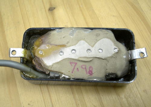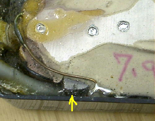 | 黄色矢印(汚くてすいません(^^;))で指しているのはマグネットです 無造作に「放り込んだ」と云った感じでエポキシパテの中に突っ込まれています こんなのでちゃんと音出るの??と思いましたが… これがちゃんと出るんです!しかもカラッ・シャキッとしたなかなか私好みな音! まぁ、ちゃんとした音が出てくれれば良いのかも知れないけど こんな造りじゃいつ何かの拍子に音が出なくなってもおかしくないよなぁ… これもアメリカン的にはノープロブレモなんでしょうか…(^^;) |