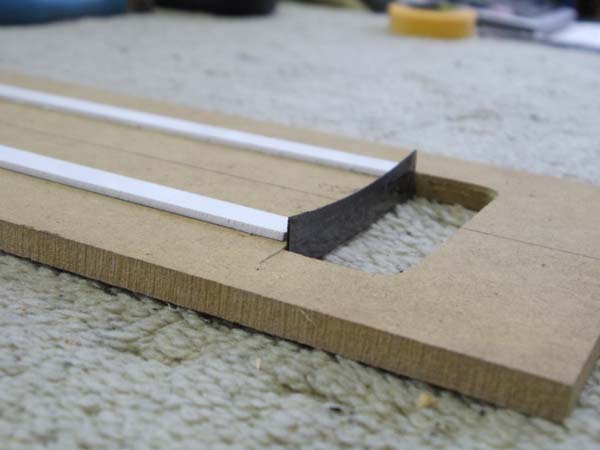 | 基材はMDFボードと云う 紙で出来た板なのですがこれが加工しやすく安価で当店では特に耐久性を必要としない冶具製作に良く使う素材です これにネック幅より少し幅広な長方形の穴を開け、穴の側面に0.5ミリ厚のアクリル板(画像の黒い板)を貼りつけ、その両端から2ミリ厚のピックガード板端材(白い細長い板)を2本貼り付けただけの冶具です 黒い板はフレット溝に差し込むので指板Rの合わせて先端を湾曲してカットしています これが出来たら加工するネックの最終フレットを抜きます |