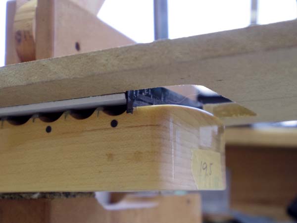 | カメラを設置する場所が無くセルフタイマーで撮影出来なかったので作業途中で機械を止めて撮影しました 画像ではちょっと分かり辛いかもしれませんがフレット溝に挿した黒い板の側面をベアリングがなぞる事でちょうどフレット溝の側面から刃物が当たりネックを削って行く訳です ネックエンドに貼ったマスキングテープに書かれている「19.5」と云う数字は削り残しの厚さが19.5以上になるようにと云う覚書で、これよりも薄くしてしまうとツバ出し部分がピックがードに当たってしまうからです |