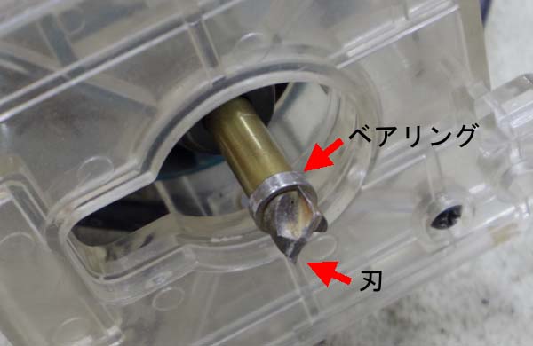 | ピックガード製作のときは先端にベアリングが付いた刃物を使用しましたが今回は刃物の奥にベアリングが付いています 仕組みは前回と同じでベアリングがなぞった通りに刃物が木を削り出すようになります |