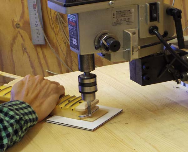 | ピックガード製作の時に使用した先端にベアリングが付いた刃物で冶具に習って削っていきます この加工に使用しているピンルーターは高速回転型の小型ボール盤(本来穴開け用の機械)と自作のフレーム&テーブルを組み合わせ去年暮れに自作したモノです |