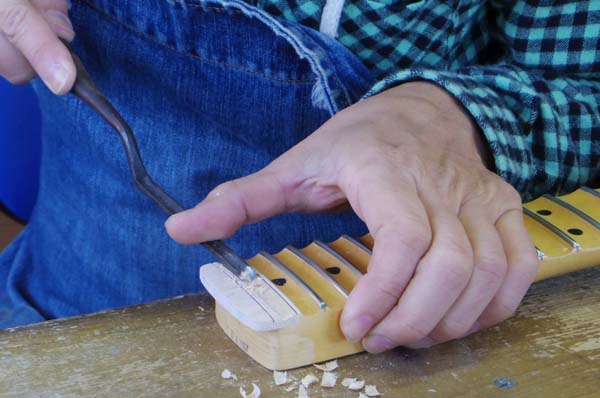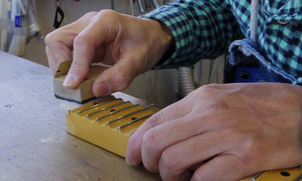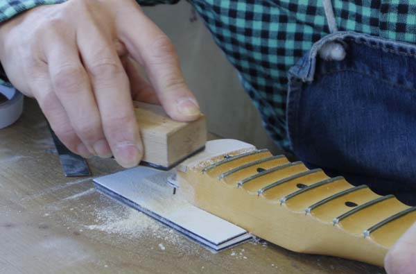 | 翌日、接着剤が固まったらツバ部分の表面を指板Rに合わせて調整します 始めは荒い目のサンドペーパーでフレットと平行に削ります 理想を言えば全部のフレットを抜いて全体に指板均しをしないと完璧に指板Rを合わせる事は出来ませんがフレットは新品状態でフレット交換するのは勿体無いですし最終フレットですので最低でも手前の20フレットより高くならなければ大丈夫です 出来ればフレット交換の際についでに加工ご依頼頂くのが理想ですね |