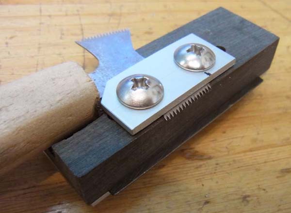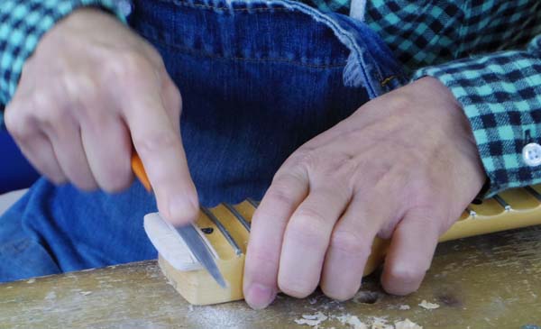 | フレットの溝切り は手持ちの22フレット仕様のネックから位置を割り出して線を引き、ブレや歪み無く直角に溝切が出来るように有り合わせの工具を組み合わせて冶具にしノコギリで溝を切っていきます |