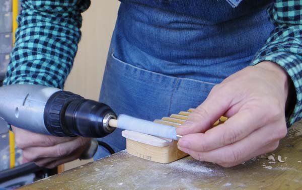 | 丸棒に貼り付けたサンドペーパーをドリルに取り付けて回転させ最終的なヤスリ傷を木目方向に整えます |