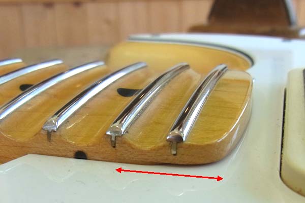 | ハイ完成! 赤矢印の間が付け足した部分です 接ぎ合わせ、着色ともに上手く行きよ〜く見ないと継ぎ足されている事は分からないと思います 今回のプラス1フレット加工はそのアイデア自体はずいぶん昔からあり、諸説はあると思いますが日本に於いては私の師匠である*PGMの乳井さんが考えられたのが初めてでした 乳井さんがESP在籍時にCharモデルを開発製作した時の事です その試作品はストラトスケールの21フレット仕様だったのですがそれをCharさんに渡したところとても気に入られたそうなのですがそれまで22フレットのムスタングをメインに使っておられたCharさんとしてはやはりもう1フレット欲しいとのリクエストがあったそうです しかもギターの出来は気に入ったので近々あるイベントでぜひ使いたいとも ボディやネックを作り直すには時間が無い… そこで閃いたのがツバ出し工法だったそうで「ツバ出し」と呼んだのも実は乳井さんで、その形がキャップ帽のひさし(ツバ)に似ていたのでツバ出しと名付けたそうです 現在良く使われていてこの記事のタイトルにもした「プラス1フレット」と言う呼び方は後から誰かが言い出したものなのです その後、Charモデルが量産される前に乳井さんはESPを退社する事になるのですがこのツバ出し工法は量産品にも採用されます 量産時には再設計すればツバ出し工法なんてしなくて良いじゃん? と思われるかも知れませんが実はこの工法には強度に関するメリットも兼ね備えていたのです |
