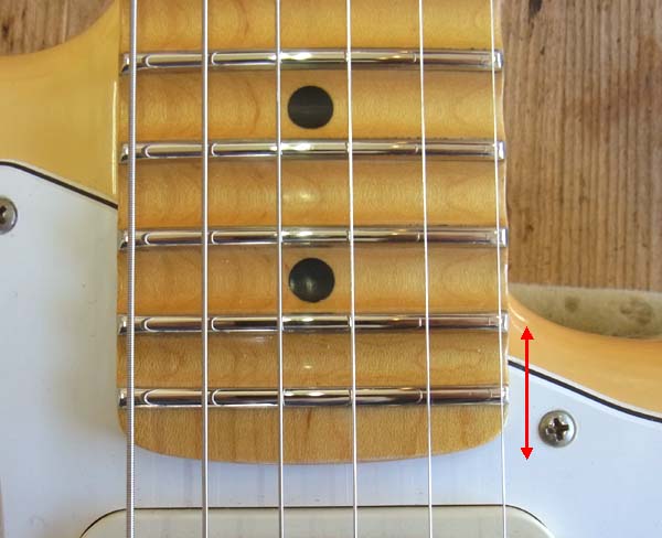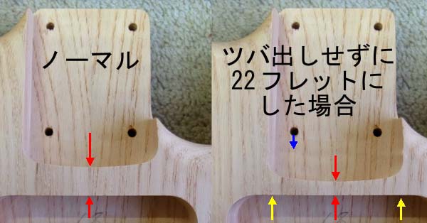 | 画像左側はノーマルのボディで右側は画像を加工してツバ出しせずに22フレットにした場合を再現しています ツバ出しを採用しなかった場合、ネックエンドも22フレットに合わせて延長しますので、それに合わせてボディのネックポケットも延長する必要がある為に赤矢印で指した部分の厚みが薄くなってしまいます ネックは弦の張力で常にブリッジ側に引っ張られていますがセットネックは接着剤の接着能力で底面、両サイド側面の3面と上画像の赤矢印部分の様にネックエンドがボディに当たる事で張力に耐えています が、ボルトオンネックはネジ強度とネジによって密着された底面の摩擦力と赤矢印部分にネックが当たる事で張力に耐えています ところがボルトオンネックはネジを強く締めていたつもりでも時としてネックやボディの収縮でネックとボディの密着が緩くなる事があり、そうなるとネジ強度と赤矢印部分の強度に頼るしか無くなります この時ノーマルボディの様に赤矢印部分の厚みがあれば張力に十分対抗する事が出来ますが右画像のように薄いとボディが負けてヒビが入ってしまう事になります 残るネジ強度ですがネジ自体は張力に耐えるだけの強度を持っていますがネジを受けるボディの穴はそれほどの強度が無く青矢印方向にネジが喰い込んでしまいますからボルトオンネックは実際のところ赤矢印部分で持っているようなモノなのです ここの強度が無いと最悪この部分が黄色矢印部分から丸ごと折れてしまう事もあります ストラトキャスターでは無いのですが某社のギターで赤矢印部分が非常に薄い上、バスウッドと云う非常に柔らかいボディ材を使用しているモデルがあるのですがこの部分が割れを起こしているのを良く見かけます ツバ出し工法にはこう云ったメリットや専用のボディを持たなくても良いので汎用性がある為に後に多くのメーカーが採用したのだと思います