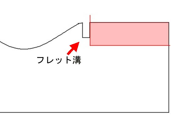 | 削れ方を絵に描くとこんな感じです ピンクの部分が削られる部分ですがフレット溝の側面から削ってこの後取り付けるツバ部分でフレット溝側面を作り直すって感じです |
