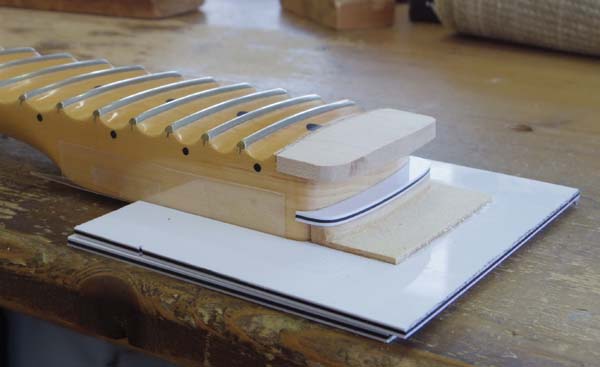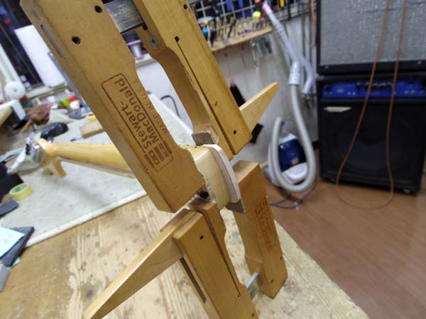 | この様にネックエンドに両面テープで貼り付けます 6弦側側面は0.2ミリの薄いアクリル板を挟んで冶具とネック幅の寸法微調整をしています この冶具を使って当店の最新兵器ピンルーターで整形します |