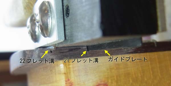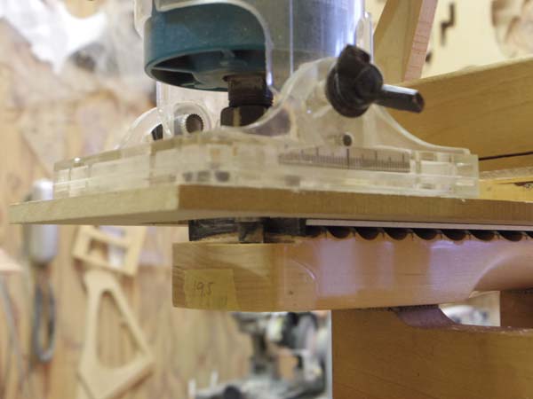 | 冶具に貼り付けた白い細長い板は湾曲した指板上で冶具を安定させる為の橋桁な訳です インチサイズのフレット溝は約0.5ミリですので黒い板はフレット溝にピッタリハマります この様にネックに冶具をセットしたらトリマーで削ります トリマーとは前回のピックガード製作でも使った電動工具ですが今回は固定テーブルから外し刃物を別な物に交換して作業します |