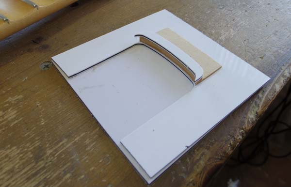 | ツバの形に大まかに切り取ったメイプル材を貼り付けます この時点で指板Rも大まかに付けています |