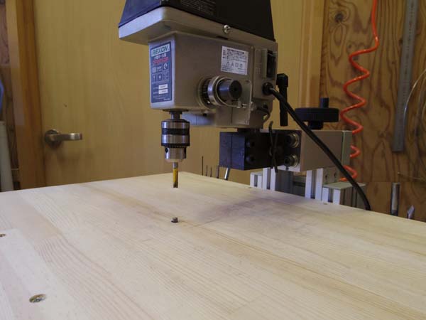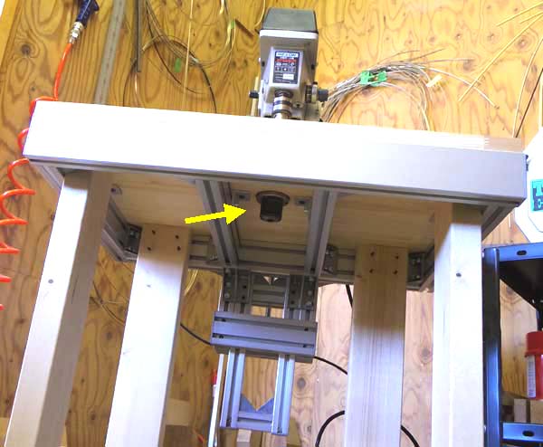 | これです 本来テーブル部分は平面精度を出した金属板を使用しますが重く高価ですし取り付け穴加工などが難しくなりますので今回製作したピンルーターは安くそこそこ平面精度の出た集成板を使用しました テーブルサイズが300ミリ×450ミリとコンパクトですのでこれで問題無いでしょう 難儀していた昇降テーブルの機構はテーブルは固定してボール盤にある刃先の昇降機能を利用する事で代用しクリアできました 普通ボール盤はハンドルを回して刃先を下ろすようになりますがそのハンドルを外しそこに自転車のブレーキ用のワイヤーを取り付けペダルで昇降できるようにしました これで両手はフリーで作業できるようになります |