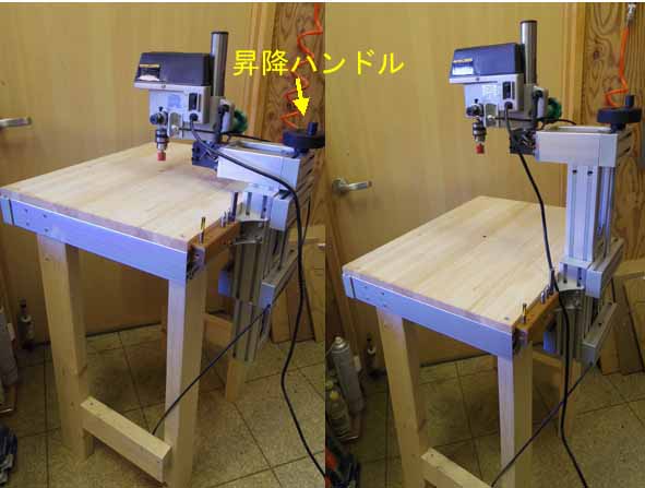 | ルーター本体の高さはこの様に昇降ハンドルで調節出来ます このピンルーターの欠点は精度が不要な部分としてテーブルの足を2×4材で作ってしまった事で腰下が軽くなってしまい昇降ハンドルを回す時にテーブルごとガタガタしてしまうようになってしまいました ルーターを降ろす時はルーターの自重でスムースに降りますが上げる時は自重と精度良く昇降させる為キツキツに組んだフレームの摩擦でスムーズには上がりません これは今後改善の余地があります と云う事で工具が好きな方には興味頂いた内容かと思います 参考までにこのピンルーターの材料費は6万円ほど ただ、組み立てる手間は結構掛かりました すでに実戦投入していますが具体的な使用方法はおいおいご紹介したいと思います 今回はただの自慢記事みたいになってしまいましたが楽器に限らず修理業と云う仕事はアイデアが肝心だと思っていますのでそう云う意味でのアピールにはなるかと。 よろしくお願いします!! |