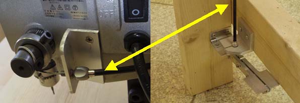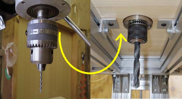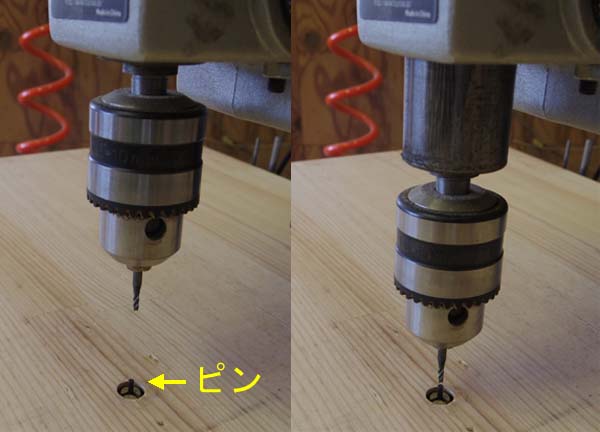 | 画像左が通常のボール盤に付いているドリルチャックですが、これはどんな寸法(何ミリ〜何ミリと範囲はありますが)の丸棒でもセンターを出して取り付けられる部品で、これを逆さにしてテーブルの底面に取り付けました 取り付け金具はさすがに特注しましたが2千円もしませんでした 右画像のようにドリルの刃をお尻から差込みテーブルの上に貫通させてピンとして使用出来るようになります この画像では分かり易いように太いドリルの刃(10ミリφ)を取り付けています すでに工房にあるドリルの刃を利用できますからコストが削減出来て、しかも0.1ミリ単位でピンの径を換える事が出来ますので出来上がりをジグよりも0.1ミリだけ小さくしたり大きくしたりと云った事が出来るようになります これは従来のピンルーターでは出来なかった事で自画自賛ではありますがコストダウンと拡張性を兼ね備えた画期的な方法と思っています!(^_^)v ちなみに本来ドリルチャックはチャックハンドルと云うT型のハンドル工具で回してドリルの刃を固定しますが今回の使い方の場合そこまでタイトに締め付ける必要は無く、チャック本体を握り込んで手締めするだけで十分です |
