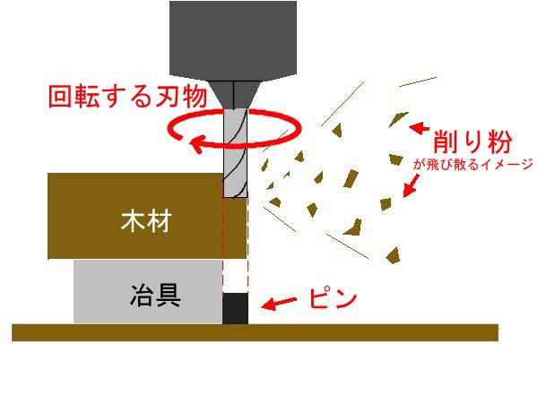 | こんな風に。 この 画像では2ミリの刃物を取り付けテーブルに2ミリのピンを取り付けています 木材など削りたい物に冶具を貼り付けて、このピンを冶具に当てなぞる事で木材が冶具と同じ形に削られます (ピンの付け根にYの字の切れ込みが入った金具がチラッと見えますがこれは後に出てくるドリルチャックの先端です) |