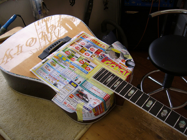 | この写真を見て不愉快に感じた方は当店と相性は良くないでしょう 「なんでこれで不愉快に??」と思われる方のほうが多いとは思いますが 稀にいらっしゃいます「D−45を広告で包むなんて信じられない!!」と言う方が… この写真はフレット交換後これからフレット擦り合わせ・バフ掛け磨きする時の状態ですが バフ掛け磨きの際に余計な部分にバフが当たらないように広告紙でボディをカバーしている訳です (実際には擦り合わせの際にはこの上からボディにゴムシートでカバーしますし バフ掛け磨きの際にはフレットだけ露出するように指板面をマスキングテープでマスキングします) ボディを汚さない為のカバーですからバフ掛けを終えるとこの広告紙はかなり汚れます つまり使い捨てにしたい部分で広告紙で済ませるのは私としては当たり前です まぁ、ある意味上の写真が私の物の考え方を象徴した一枚と言えます 「適材適所、必要以上の事はしない」つまりはお客様に無駄な出費はさせたくないと言う事です どんな世界でもマニアな世界には実用を超えた“Something”を求める方が多くいらっしゃるようですが 私はその“Something”に答えるつもりはありません こう云うショップをしていると「こだわりの職人」なんて思われがちですが 私は「こだわらないの職人」と公言していますし お客様にも「こだわる事はお金の無駄遣いや結果として遠回りなりかねない」と言っています 私がお客様によく言う言葉がありまして、それは「そんな事しても大して変わらないよ!」です(^_^) 最近はネットが普及したおかげで色んな情報を簡単に手に入れられます が、そのせいで色んなウソや勘違いが さも真実のように語り合われ広がっているのも事実です (私からすれば鼻で笑ってしまうようなことを熱く議論していたりして しかも双方とも間違っていたりします(^_^;)) そう云ったところで情報を入手してきて「このパーツをこれに換えて欲しい」とか言われる事がよくありますが 私からすると意味無いよ〜と思う事が少なくないのです しかもそのこだわりのパーツとやらはこれがまたベラボウに高いのです! パーツを持ち込まれて頼まれれば仕事は受けますがあまり面白い仕事ではありません 完成したとき効果を感じられ無ければお金をもらっても面白いもんじゃありませんから。 ただ、こう云った場合 パーツ持込での依頼ですからそのパーツに対する責任は私に無いわけで 完成したギターを弾いたお客さんが「あれぇ…?」てな顔をした時は 「プププ」なんて心の中で思ったりしましますがね(^_^) 私は私自身が効果を感じられる事しかお客様にはお勧めしません よくリペアショップが勧めている「定期的なメンテナンス」も当店ではお勧めしていません 現状に違和感が無ければ無駄な金は使う必要なし!ということです 自分で気付いているマニアの人もいるでしょうが マニア度が深くなるほどショップの「カモ」になりやすいのです! 「鳴り」とか「抜け」とか言われるとそれだけで納得してしまったりしませんか?? たまに「お金はいくらでも出すから」と自らカモになりたがる人も居たりますが…(^_^;) リペアショップを選ぶときにはまず自分の考えを理解してもらえるかと言う事がとても重要です リペアショップに学ぶ事は無いと思います。自分の考えを理解してもらえるかが重要なのです Aさんが絶賛しているショップをBさんは酷評するなんて事よくあるでしょう? 互いの求めるものが違えば満足度も違って当然です ときに仕上がりよりも理屈やウンチク口上でお客さんを納得させるショップもありますが 「こだわり」をショップに求める人にとってはそう云うショップはある意味満足度が高いかもしれません それはそれで良いんではないか、と私は思います 「なにをして満足するか」は人それぞれなのですから。 ここで上の写真になります 上の写真を見て不愉快に感じる方は いくら仕上がり良く仕上がっても 何か納得いかないものを感じるのではないでしょうか? 私はそう云う考えがあるという事は認められても理解する事は出来ません つまりそう云う人はウチとは相性が良くないと云う事です ギターを弾くのはあなたですからあなたが納得出来なければ意味がありません つまりはあなたが「自分」を持って主張できなければならないと言う事でもあります 自分を持って主張できないから人の言う事に左右されてカモになってしまうのですよ! なんて事を言ってはおりますが、経営が苦しくなればカモに頼るしかなくなるカモです(^_^;) もし将来私があの手この手と重箱の隅を突付く様なマニアックな事を言い出したら 「あ〜経営苦しくなったんだ」と思ってください え?今で十分マニアックだって?(^_^;) |