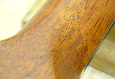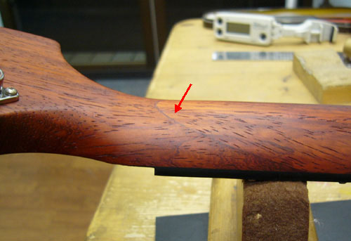 | 赤矢印で指された部分が接合部となります 木目の向きから見るとなるほどこれなら木目に沿って折れるような事は少なそうです しかし!です レスポールのように簡単に折れないにせよ強い衝撃を受ければ どこかにその皺寄せがくるはずでスカーフジョイントの場合は指板が剥がれたり このように接合部が剥がれたりしますので強度確保と云う意味合いは余りありません では何故このような事をするのか?まぁ、たいていの人は分かると思いますが… そう、材木の節約ですね |