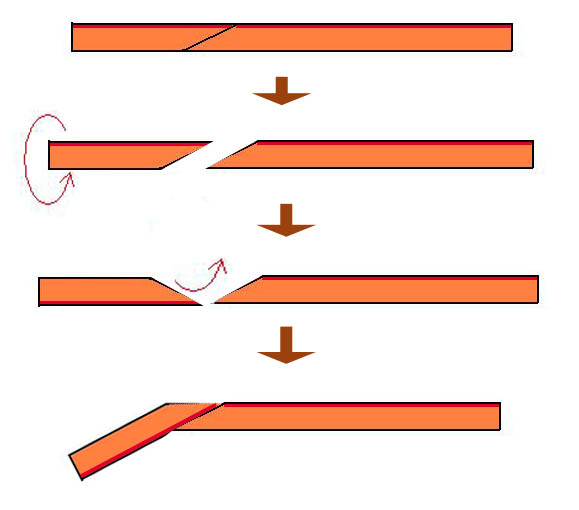 | 材木を接木すると接着面を境に双方で別々な変形を起こします これは一本の材木を2分割し再び同じ形に接木しても少なからず起きる現象です これもクラシックギターのようにヘッドの中心辺りで接木していれば たとえ変形が出てもヘッドが少し反るくらいで演奏上は何ら影響しませんが スカーフジョイントの場合、上図のように指板下で接木をされている為 変形が起きると演奏上支障をきたす部分が変形してしまうわけです 上図にマウスポインターを合わせてみて下さい これは分かりやすくするためにかなり大げさに表現していますが このように接合部(指板上の矢印)を境に逆ぞりを起こす例が非常に多いのです スカーフジョイントの場合は上の加工工程解説図のように ヘッド部を上下裏返して貼り付けますし、「ネック折れしにくい」と云う根拠になる木目の向きが ヘッド部とグリップ部の変形の仕方を変える原因となりこういった現象が起きやすくなります こうなると2フレットに対して1フレット、ナットが低くなり 1フレットや開放弦でビリつきが出るようになります 普通の逆ぞりであればトラスロッドで調整する事が出来るかもしれませんが トラスロッドはこの様な局部的な反りには対応できませんから 修理するには指板修正するしかありません これがスカーフジョイントの問題点です 先にも述べたように私は材木節約には大いに賛成です その私が見て感動したのはテイラーのこの接合方法… |