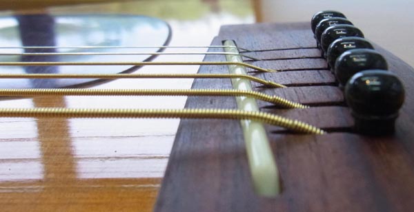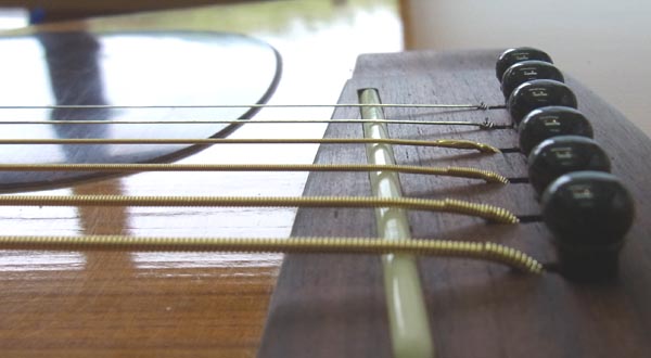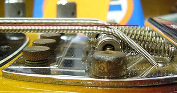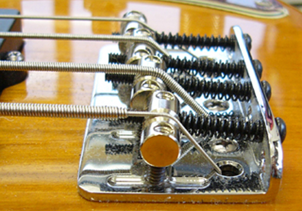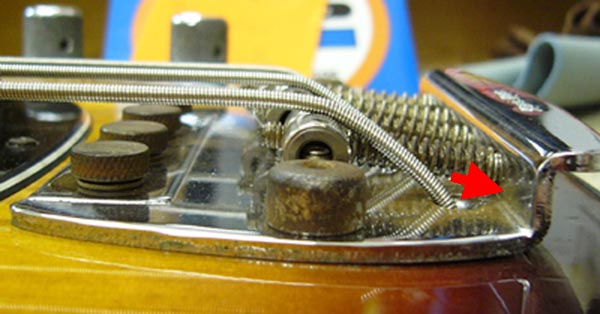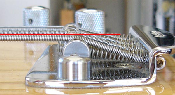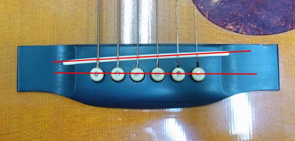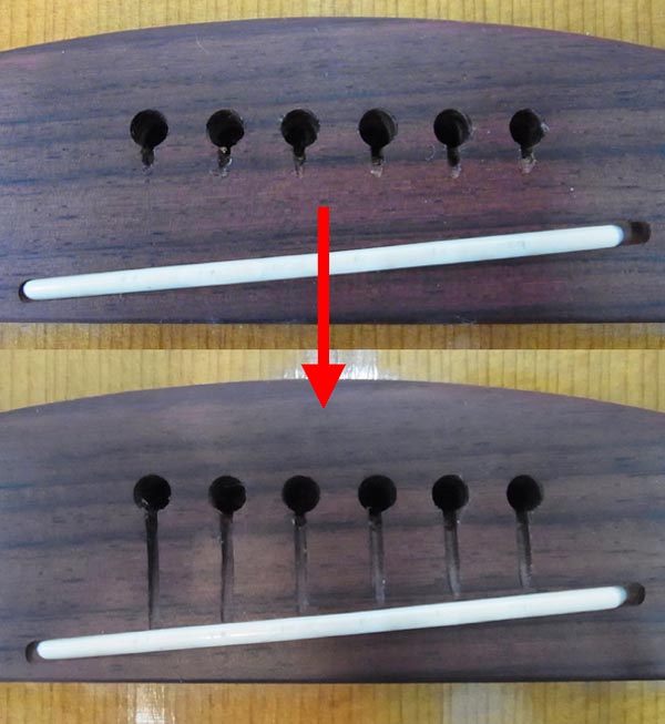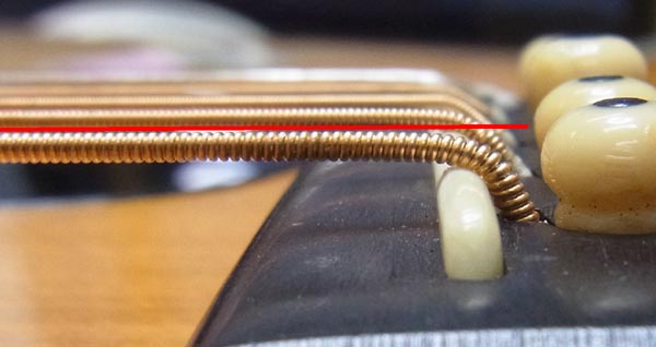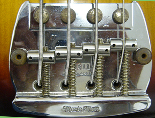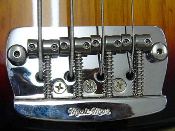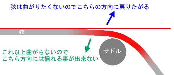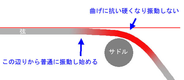 | もう20年近く前の事ですが、前職場のハイエンドギターズ在籍時にミュージックマンスティングレイベースのジャパンバージョンを製造する事になりました パーツ類は全てアメリカのアーニーボールから支給されてボディネックを日本国内で製作しハイエンドギターズで組み込むと云うプロジェクトです 当時アメリカで製作されていた仕様と同じモデルと平行して70年代に神田商会がミュージックマンから支給されていたデッドストックパーツでヴェンテージスティングレイの復刻モデルも製造していました (ずいぶん前の事ですのではっきり覚えていないのですがひょっとしたら先に復刻モデルを製造していたかも?) なんでも70年代にもスティングレイのジャパンバージョンを製造する計画があり、パーツをミュージックマンから支給されていたんですが何だかの理由で計画がポシャり、パーツだけが20年以上も神田商会にストックされていたらしいのです アーニーボールからジャパンバージョンの製造許可を得た機会にこのデッドストックのパーツも使って復刻版を作ろうとなったのですがアーニーボールでさえ持っていない70年代のパーツを使用して製作するとあって大変な人気になりました 特に当時のスティングレイの特徴である裏通しブリッジ!これがヴィンテージスティングレイを手に入れられなかった方や、当時の品質に満足出来なかった方には大きな魅力になっていました 裏通しのブリッジの意味が分からない方のために↓ ![]() 弦をブリッジの後ろから通すのでは無く、ボディの裏側を通して張るので「裏通し」と呼ばれるのですが、これがヴィンテージスティングレイの大きな特徴でした 当時はこの様に裏通しにする事でテンションが強くなりサスティンが良くなると言われていたんです その復刻版スティングレイ(機種名スティングレイVT)の試作サンプルを組み込み、サウンドチェックをした時ある事に気が付きました 4弦のサスティンが著しく短いんです 1,2弦はビシッとタイトなあのヴィンテージスティングレイのイメージそのままなんですが、3弦は何となく、4弦は明らかに音の伸びが悪くまるでミュートが掛かったように「ガボンッ」としか鳴らないんです 上画像のブリッジでは外されていますがこの機種のブリッジにはミュート機能があり、サドルの手前にゴムスポンジの付いた板が取り付けられていて、弦の下にある丸いダイヤルでこの板の高さ調整をしてゴムスポンジを弦に当てる事で弦振動をミュートさせるようになっていました そのミュートが弦に当たってるのかと確認しましたが全く当たっていません 弦が不良なのかと別の弦に換えてみましたが全く同じ… 私は独立して修理業を始めるまでずっと製造をしていましたので他社の楽器に触れる機会が少なく、実は裏通しタイプのスティングレイを弾くのはほぼ初めてだったのです 一体何が原因なんだろうと頭を抱えつつとりあえず試作サンプルを神田商会に提出したところ、何の意見も無く製造開始のOKが出ました 弦やパーツに原因が無ければボディやネックの個体差かもと日産6本ペースの製造に入りましたが、やはり出来上がる全てで4弦は「ガボンッ」としか鳴らないんです 「困った…何でや??」 と思っていろんな所を改めて詳細にチェックした時にある事に気が付きました ![]() 4弦がサドルのところで窮屈そうに曲がっていたのです 画像では分かり易いように弦上に直線を引きましたが、弦がサドルの上で綺麗に曲がらずに弧を描くようになっているのがお分かり頂けるでしょうか? 4弦の上に写っている3弦の曲がり方と比べると分かり易いと思いますが、「コクン」と曲がっている3弦と比べて4弦はいかにも曲がりたくないのに無理やり曲げられた感があるように見えます 赤い線と4弦の上面がサドルに向かって隙間が広がって行き、サドル真上では3弦の太さ分くらいの隙間が出来てしまっています 弦の張力に対して弦の剛性(この場合曲げに対しての頑丈さ・硬さ)が負ければ画像の3弦のように「コクン」と曲がりますが、4弦は剛性が張力に勝る為、サドル上で曲がらずにこの様に弧を描いてしまうようなんです ではナゼそうなるとサスティンが低下するのか?イメージイラストにしてみました ![]() 4弦のサドル上で弧を描いている部分は曲がるのを嫌がって耐えています 張力に抗って曲がらないくらいですからこの部分は硬く緊張し振動しません (イラストでは硬く緊張している部分を赤に、徐々に緊張が解れる様子をグラデーションで表しています) 本来、振動する弦の両端はナット或いはフレット〜サドル真上でないといけないのですが、この場合4弦はサドル真上では硬くなっているため振動せず、イラストのグラデーションのように徐々に緊張を解して行きサドルから離れた所から普通に振動するようになります ![]() この時、グラデーションで表したした部分はイラストの様に曲げられるのに逆らい青矢印方向に戻ろうとする力(弦の剛