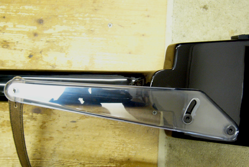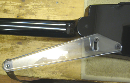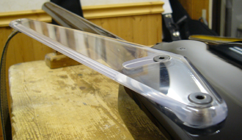 | いきなり完成形になってしまいましたが(^_^;) 8o厚のポリカーボネート板から切り出して製作しています ご存知の方もいらっしゃると思いますがポリカーボネート材は 航空機のキャノピーグラスに使用されている耐衝撃性・耐久性に優れ、かつ軽量・安価な素材です まぁカーボングラファイト素材なんかで製作すれば更に強靭な物が作れるでしょうが 素材自体がかなり高価なのと切り出し作業が大変(バンドソーなんかで切ると火花が散ります) ですしポリカーボネートは総合的に見て適材なのではと思います 透明なのがまたおしゃれな感じがするんですけどどうでしょう? |