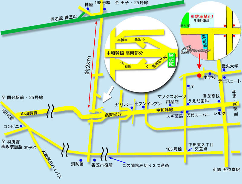 お越しの際は事前にご予約お願いいたします 当店は普通の住宅街の中にあり 初めての方は 「こんな場所にあるはずが無い、道に迷った」 と思われる方もいらっしゃる様な場所にあります 不便お掛けいたしまして申し訳ありません ■電車でお越しの方 最寄の駅は近鉄大阪線「五位堂駅」 またはJR和歌山線「香芝駅」です JRにも「五位堂駅」がありますが こちらは遠くなりますのでお間違えの無いよう ご注意下さい 電車でお越しの場合は駅までお迎えに参りますので事前にご連絡頂きますようお願いいたします(徒歩ですと駅から20分くらい掛かります) ■西名阪 香芝ICからのアクセス 香芝IC出口から突き当たりを右折 更に突き当たり右折して168号線に入ります 約2qほど直進すると高架橋が見えます 高架橋下の信号を右折「本線」→「高架」を直進し 中和幹線に合流します そこから3つ目の信号(うえだ歯科の看板が目印)を左折、突き当たりを右折です ■大阪(柏原)方面からのアクセス 国道25号線を奈良(高田)方面に向かってください 近鉄国分駅前の分岐を165号線側に直進 智辯学園高等部の前を通り「穴虫西」の信号を左折し 中和幹線に入ってください そこから4qほど先左側に「ガリバー」が見えたら3つ目(ガリバー前の信号含む)の信号(うえだ歯科の看板が目印)を左折、突き当たりを右折です 経路地図リンク ■京都・奈良北部より京阪奈道(大和御所道路)をご利用の場合 京阪奈道(大和御所道路) 橿原北ICを出て頂き「土橋町南」の信号を右折して中和幹線に入ります 約6qほど先に「香芝高校前」の信号(シルクが目印)がありますのでその次の信号を右折 次の突き当りを右折です 経路地図リンク ■和歌山方面・南阪奈道路 太子ICからのアクセス 太子ICを出てすぐの信号を直進して頂き次のT字路を右折 2qほど先の「穴虫」の信号(コンビにが目印)を左折、すぐ先の「穴虫西」の信号を右折して中和幹線に入って下さい そこから4qほど先左側に「ガリバー」が見えたら3つ目(ガリバー前の信号含む)の信号(うえだ歯科の看板が目印)を左折、突き当たりを右折です 経路地図リンク 駐車スペースは店舗のすぐ横に1台分ご用意しております 店舗前道を挟んだ駐車場は月極駐車場ですのでこちらへの駐車はご遠慮下さい スペースが狭くて申し訳ありませんが多少道路側にはみ出して駐車下さって結構です もし駐車し難いようでしたら誘導させて頂きますのでお気軽にお声をおかけ下さい 当店駐車スペース以外に駐車されますと周辺住宅のご迷惑になりますのでご遠慮下さい もし駐車場が詰っておりましたら一言お掛け下さい 誘導させて頂きます |