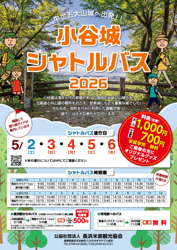 2026年04月10日 2026年5月2日(土)~6日(水) 上記の期間は小谷城シャトルバスが運行します。 期間中、小谷山林道はシャトルバス以外の車両は通行できません。 おもて ![]() 大きい画像で見る うら ![]() 大きい画像で見る 小谷城シャトルバスの運行に関してのお問い合わせ 【公益社団法人長浜米原観光協会】(TEL/0749-53-2650)まで