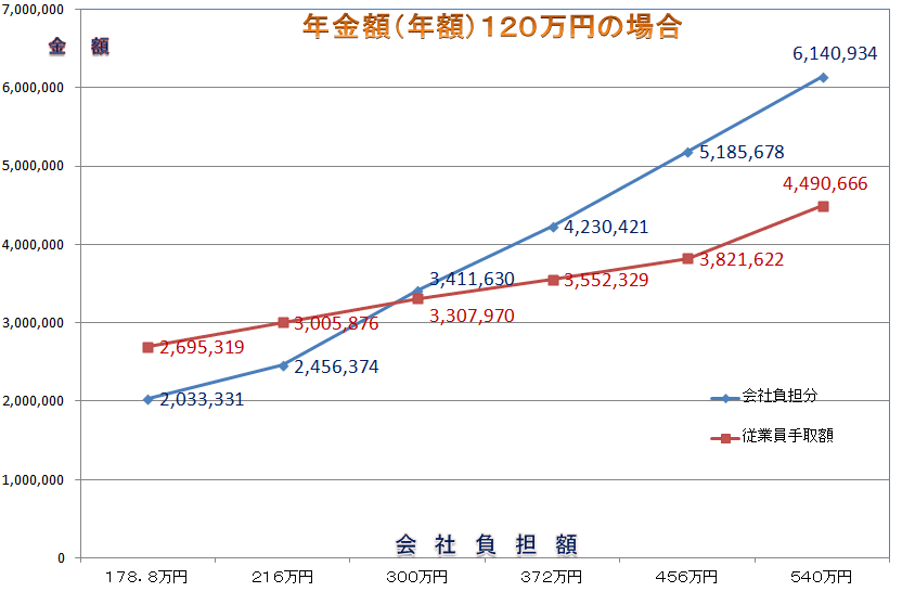 | 想定条件 | 年間会社負担分 | 従業員年間手取概算額 | 年金停止額 | ||||||