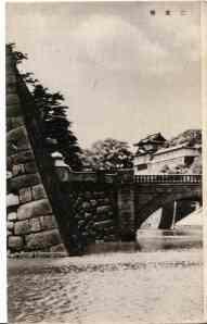 | 宮城の正門、即ち俗に言う二重橋であります。長禄元年、鎌倉管領上杉定正の家臣太田持資入道道灌が、武蔵野の荒野の中に築いた城を、後に徳川家康が居城と定めて、幕府三百年の基を開きました。当時は今の丸の内あたりが海辺だったといいますから、その眺望といい、その要害といい、実に好適な居城だったと思われます。 |
