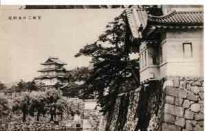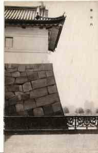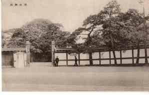 | 明治元年、畏くも江戸城を皇居と定めさせられ、同六年の炎上後、十七年御起工、二十一年十月に御竣工相成ったのが、今日の宮城であります。このあたり、お濠の水と、石垣の松と、宮殿の甍とが相映じ、千萬年揺らぐことなき大内山の瑞色が漂っていて、我知らず頭の下がる思いがいたします。遙かに聳えているのが二の丸です。 |