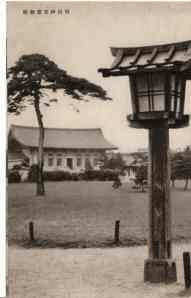 | ここは旧幕時代の武家屋敷の跡で、嘗て練兵場となり、また明治天皇御大葬の際は、御じゅ車停駐の葬場殿址として、明治天皇とは特に御関係の深い土地であります。正面に見える石造の建物は聖徳記念絵書館で、当代一流の書伯が執筆した、明治大帝御一代の御事績書譜を陳列してあり、一般の拝観が許されます。 |