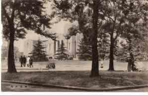 | 日本青年館は神宮外苑にあります。この附近に、神宮競技場、野球場、角力場、プールなどの大規模の運動競技場が設備されてあります。春秋のスポーツシーズンには、ここからラヂオで全国に中継放送が行われて、全国のスポーツファンの血を沸き立たせます。 |