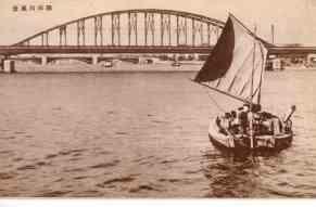 | この鉄橋は、両国駅とお茶の水駅を結ぶ省線電車の高架線です。昭和七年七月一日から開通して、房総方面と東京市内戸の交通が非常に便利になりました。隅田川もこの辺になると、如何にも大川らしくゆったりとしていて、東京名物の一銭蒸気やら、帆をはらんだ荷足舟などが右往左往しています。鉄橋の遙か向こうに見えるのは蔵前橋です。 |
