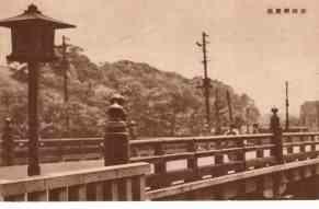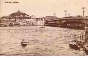 | 昔はここが、武蔵と下総との国境であったために、両国橋の名が付けられたものであります。震災後、現在の瀟洒な橋梁に改築されました。この左手に、お茶の水と両国を結ぶ省線電車の高架線があります。江戸風物の一つとして有名な両国の川開きは、今でも毎年この附近で行われます。先方に見える圓屋根は、角力で名高い国技館の大鉄傘です。 |