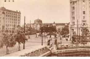 | 和田倉門付近から見た東京駅です。東京駅は東海道本線の起点で、日本全国の交通網の心臓部をなしています。ルネッサンス式の鉄骨煉瓦石材造りの大建物は、流石に日本一の大ステーションの名に背かぬものであります。右手の建物は郵船ビルディング、左手の建物は海上ビルディングであります。 |