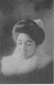 束髪の女性が伏し目がちにうつむいています。襟巻きが暖かそうです。