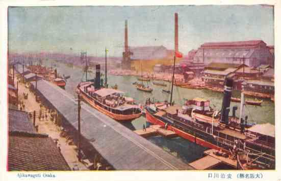 安治川口は当時、「安治川大湊」として大変に賑わっていたようです。絵葉書の構図は、種々の資料から手前側が南岸であり、対岸が、おそらく現在、中央卸売市場のある場所であると考えられます。