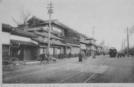 明治後期の岐阜市内の風景と思われます。旅館の前には路面電車が走り、傍らには大八車が行き交います。又、遠景には人力車と思われるものも写っています。