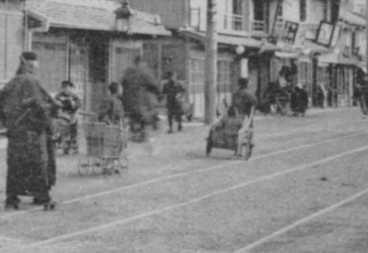 左方に乳母車が写っています。すぐ右には(流れていますが)自転車に乗る人のようです。奥、電柱の右、看板の下には人力車と思われるものがあります。
